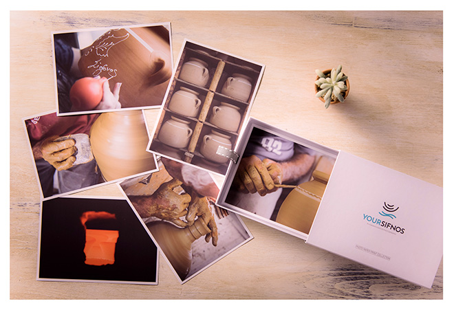 To Photobox είναι μια συλλογή 12 θεματικών φωτογραφιών, με εικόνες από τη Σίφνο, εκτυπωμένων με προδιαγραφές Mini-Lab σε υψηλής ποιότητας luster φωτογραφικό χαρτί. Ένα από τα 4 διαφορετικά Photoboxes είναι αυτό με θέμα την τέχνη της Αγγειοπλαστικής, μια τέχνη που χάνεται στο βάθος του χρόνου και έκανε τη Σίφνο ξακουστή. Οι φωτογραφίες ξεδιπλώνουν όλη τη διαδικασία μεταμόρφωσης του πηλού σε ένα χρηστικό σκεύος ή ένα διακοσμητικό αντικείμενο.