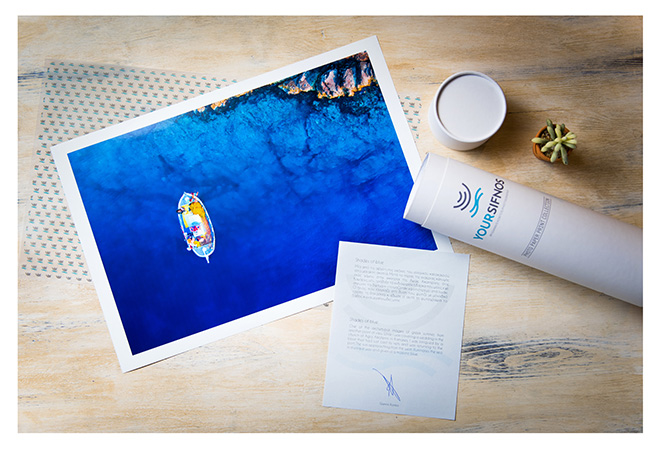 Οι φωτογραφίες είναι εκτυπωμένες με προδιαγραφές Canon σε υψηλής ποιότητας φωτογραφικό χαρτί Luster, για ζωντανά χρώματα που αντέχουν στο χρόνο. Θα τις βρείτε σε 2 μεγέθη Α4 και Α3+ και συνοδεύονται από μια χειροποίητη κυλινδρική συσκευασία, που επιτρέπει την εύκολη και ασφαλή μεταφορά τους.